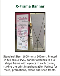 | We combine low cost with very fast turn-around time and quality. PVC banners are ideal for a wide range of marketing activities. Trade shows, lobbies, road shows, product launches, outdoor events, sports events, schools, point-of-sale displays, marketing campaigns, product advertising and even exhibitions. Our free-standing banners can be setup in no time and moved anywhere when needed. When it comes to our clients’ needs we have an innovative, can-do approach that gets clients what they want, when they want it. Our talented in-house design team also offer a bespoke banner printing service so your logo, design or wording can be brought to life thanks to our high quality printing and expert manufacturing. We do intensive product research, both locally and internationally, allowing us and our clients to keep abreast of the latest trends. For more information & samples email us: office@xgraphics.co.za | ||||||||||